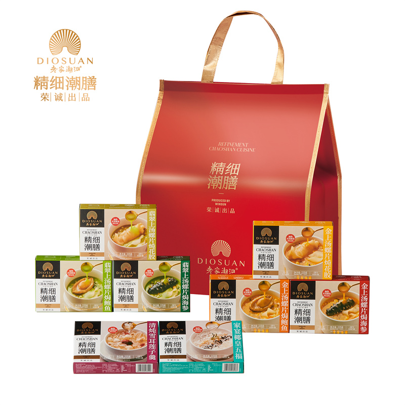 225g翡翠上湯螺片焗鮑魚x1,225g翡翠上湯螺片焗海參x1,225g翡翠上湯螺片燉花膠x1,225g金上湯螺片焗鮑魚x1,225g金上湯螺片焗海參x1,225g金上湯螺片燉花膠x1,225g家宴椰皇五福x1,225g清燉雪耳蓮子羹x1